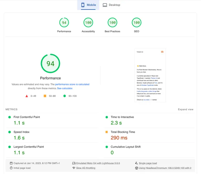 There are some perf improvements that could have been done on my old site, but it was still all green.