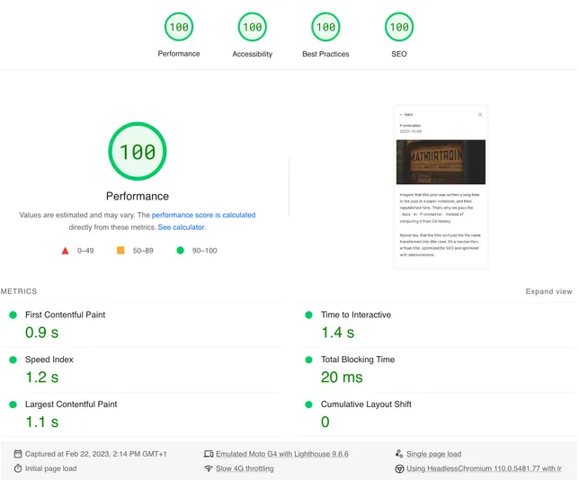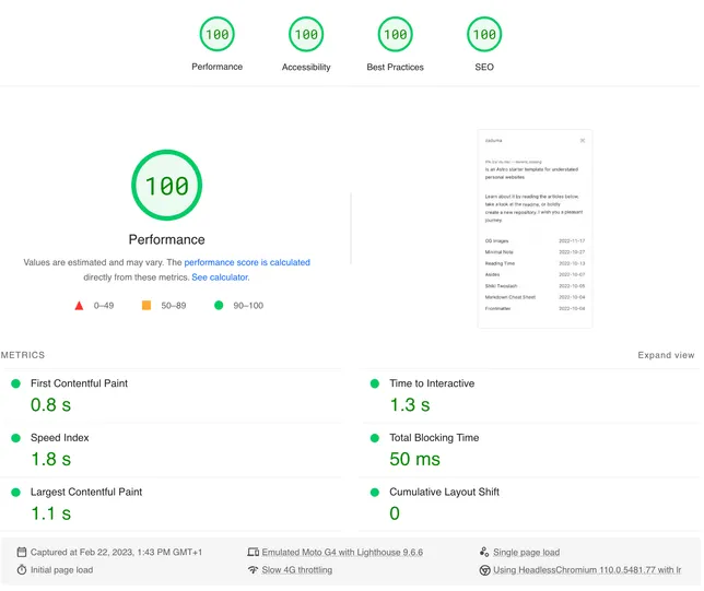 With Astro, Astro Image and Plaiceholder, we top that. Turns out a black-and-white website with little to no content is pretty fast. May not be much to celebrate, but getting a FCP under one second, and 4x100 scores on web.dev/measure makes me smile a bit.